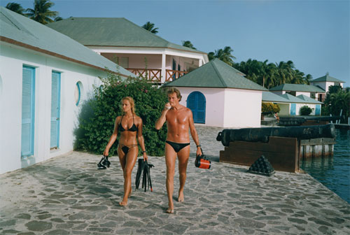 Despite their evidence of a plastic-and-polyester society, his photographs of vacation sites such as Martha’s Vineyard, the Everglades, and Cape Canaveral recall the revelry, music making, amorous dalliances, and peaceable kingdoms seen in depictions of the Golden Age. A nude couple converses on the beach, a guitar temporarily at rest, while a Dalmatian sleeps, color-coordinated with the sand (plate 40). A ripe young woman cradles a snake while dappled light and patches of color embroider the scene into a sensuous tapestry (plate 37). Barely clad, prepubescent girls luxuriate on the hood of a car, drenched in the sun’s magic, while adults relax inside the car or mount trailers to witness the view (plate 41).