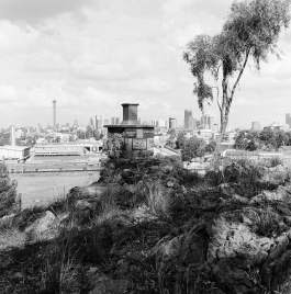 This image is entitled “The FNB Soccer City stadium built for the World Cup of July 2010, and the ruins of Shareworld which was built and went Bankrupt in the 1980s. Shareworld was intended as a theme park for the citizens of Soweto. 6 June 2009”. It is one of David Goldblatt’s recent large (95,5x125cm) color cityscapes that he has been producing for the last 6 or 7 years. It is interesting to notice how both buildings (or what’s left of them) are essentially of the same nature: entertainment venues for the masses, built 40 years apart from one another. In the first case aimed at a world wide population gathered in South Africa (or in front of their TVs) for the soccer world cup of 2010, in the second case aimed only at the black population of the Soweto ghetto.