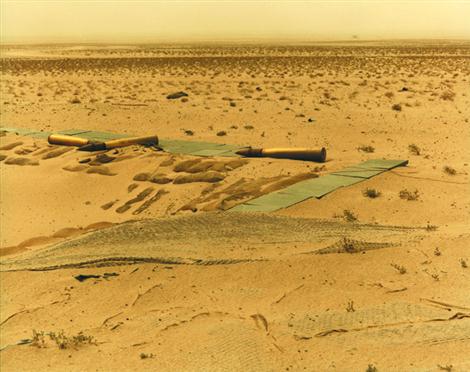 In both the book, and the installation of the same name, each unidentified image succeeds another in no discernible order except for this tendency to wildly vary the point of view. The mental choreography of constant reorientation is demanding of the viewer; we must continually resituate ourselves as each successive image changes our perspective in relation to the scene (from the ground, from the air, from a lateral distance, close-up, etc). Occasionally, an image appears that is not ambiguous, such as of cheap wool blankets that Iraqi soldiers abandoned in their trenches. These blankets have the intensely sentimental fascination of Van Gogh’s famous shoes. And there is indeed a pair of shoes in Fait, vitrified and barely distinguishable from the ocean of sand that surrounds us in these pictures. Here, bulldozed ponds of crude that retreating Iraqi troops were unable to ignite; there, an erratic convoy of military vehicles charred to a bright red rust. The list of details also includes half-blasted bunkers, acres of spent material and miles and miles of trenches. Burning oil derricks appear on the infrequent horizon.