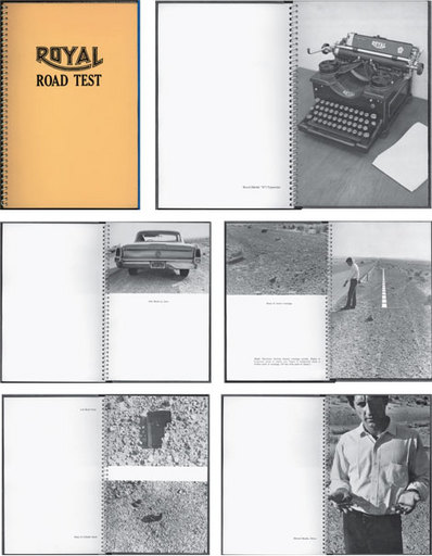 Royal Road Test takes the celebrated Kerouac typewriter and tosses it from the car into the desert, where it breaks against the gravel and becomes so much wreckage, finally part and parcel with the ground. Ruscha and collaborators Williams and Patrick Blackwell then go to great lengths to document the physical traces of the event in its aftermath, which results in a book of photographs of typewriter parts embedded in dirt and sand that occupy the entirety of the frame. The plane of vision is literally smashed into the desert ground. The viewer arrives after the test has happened, to confront wreckage, and the aftermath of violent impact is nonetheless neatly contained in the pages of a discrete book.