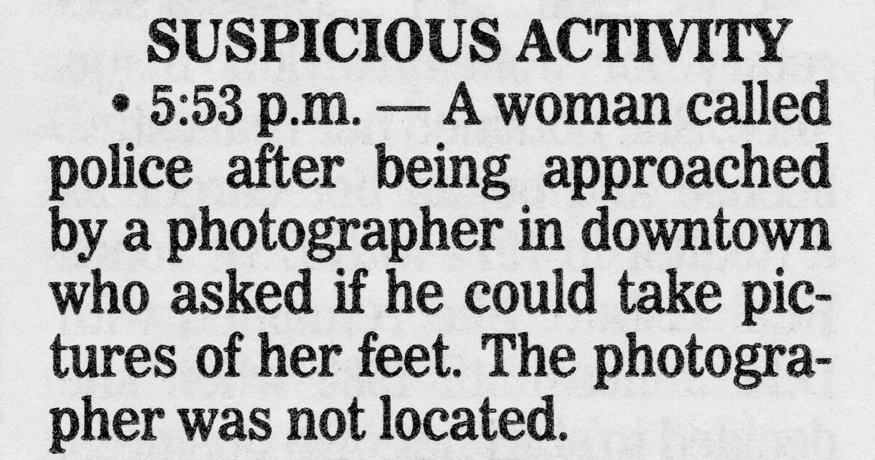 AS: Yes – in a sense this project started in the summer of 2014, when I was visiting my parents for a few days in Amherst, Massachusetts. One morning, I was flipping through their local, weekly newspaper – the Amherst Bulletin – just to see if anything interesting was going on in town, and came across a page with the heading “Police Reports”. I started reading through them, and amongst the more generic and banal activities reported – fender benders, minor acts of vandalism, loud parties, and so on – I discovered several more unique, seemingly surreal and somewhat absurd reports of events (or non-events) that genuinely made me laugh out loud. For example, some of the first ones I found, which I took pictures of and posted on Facebook at the time, read: