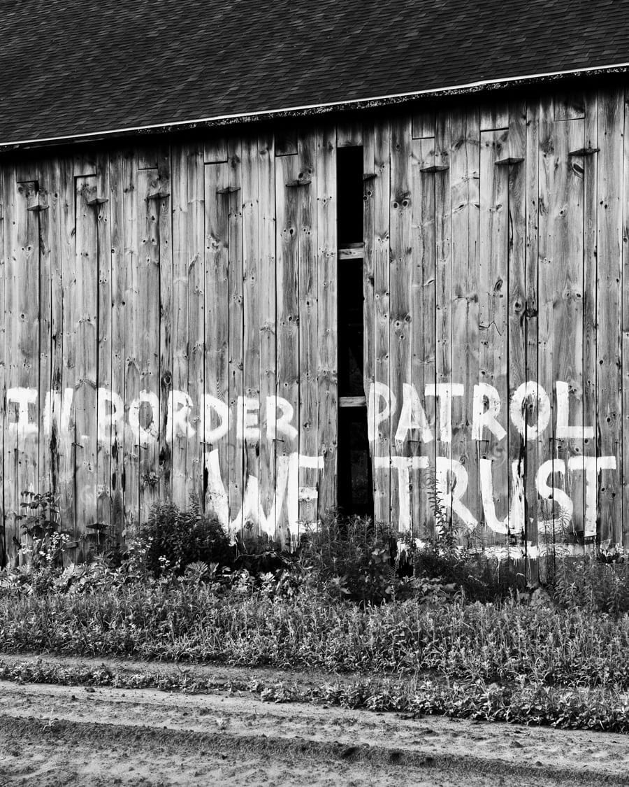 For example, more than fifteen years ago I took a photograph of an old tobacco barn in the area that, ever since I’ve known it, has been covered in graffiti – Bobby ♥ Sue, etc. In my original early-2000s photograph (which I included in the first ever issue of SeeSaw Magazine – http://seesawmagazine.com/winter_pages/hear_the_music.html ) the graffiti is mainly romantic lyrics from Led Zeppelin’s Stairway to Heaven – “IF THE SUN REFUSED TO SHINE, I WOULD STILL BE LOVING YOU”. During my trip back to western Mass in 2018 for SLANT, I suddenly remembered this barn, and spent an hour or so driving up and down back roads trying to re-find it. Eventually, I saw it on the horizon still covered in graffiti, but as I approached I realized the tone of much of the graffiti had significantly changed – it now read, “IN BORDER PATROL WE TRUST”.