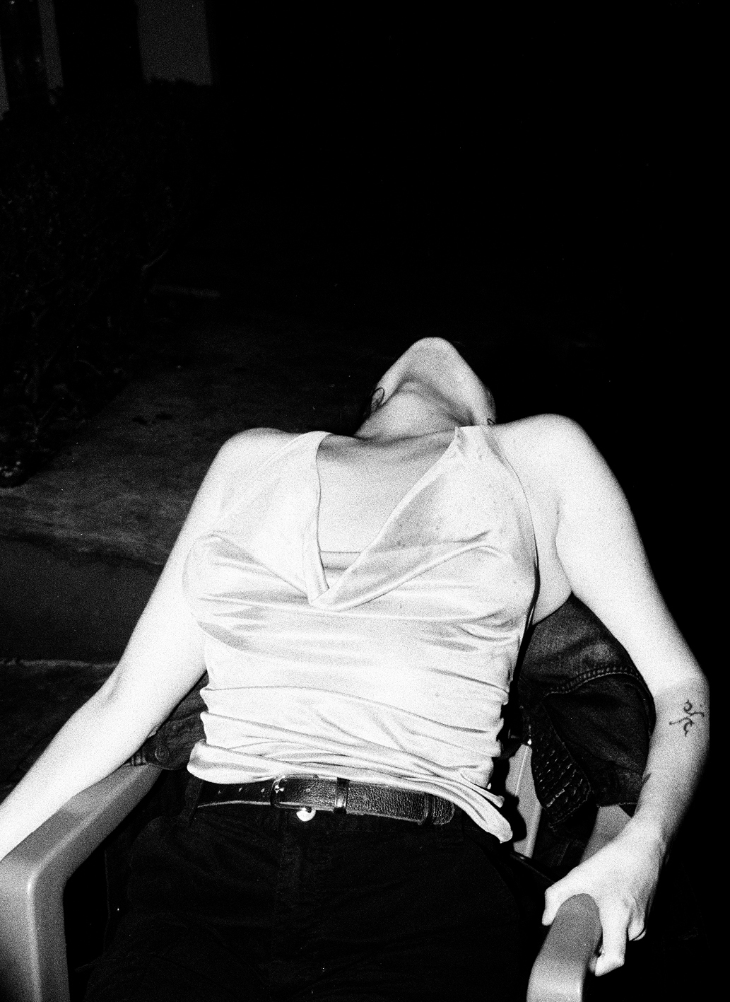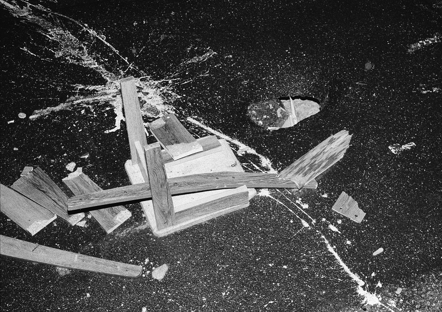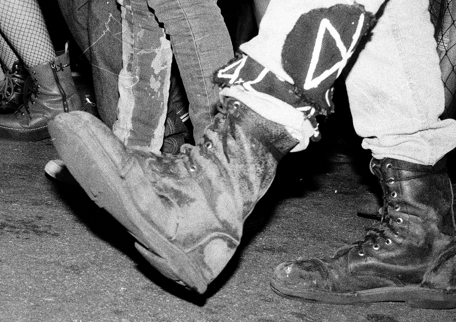Throughout André’s book, the atmosphere is thick with smoke, claustrophobic with dense black tones, low-lit interiors, and the sweat of punks skanking to the pulsing d-beat of whichever band seems to be illuminating the way. Many of the photographs were made in Buenos Aires, and you can also feel a police presence in the book through pictures of the riot police, scrawled on paint-chipped walls, reminding the reader of social struggle and uncertainty. This is particularly effective at raising the temperature of the work. There are also more serene passages of bodies lying over chairs or floating atop water, recumbent and effortless, offering one of the vital ingredients of subculture story: glimpses, however brief, of hope and potential. Without this, everything would be dystopian and lost, which is cynical and bereft of the romanticism that punk also values. Note that you rarely encounter a punk; you encounter punks, in the plural, which suggests fraternity.