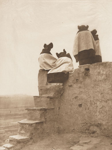 Two images in particular, The Vanishing Race and Watching the Dancers, demonstrate Curtis’ faith in the ethnographic myth that I mentioned above. In The Vanishing Race, an emphasis is placed on the composition and the movement of the horses, which are heading towards the horizon. The faces and dress of the Indians who ride them are not important; this is an image which depicts Curtis’ conviction that the Indians were doomed to extinction and he shows them riding off into eternity. The second image, Watching the Dancers, is similar in its message. While it does portray some aspects of tribal costume–the white robes and the circular hairstyles–the image is of Indians perched on the brink of a precipice while they watch their brethren dance below. It is as if Curtis is suggesting that even the Indians were aware of their own passing.